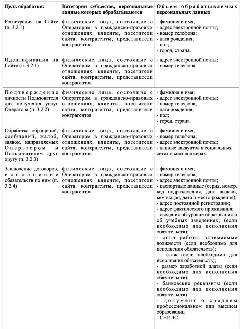 4.1 Объем обрабатываемых Оператором персональных данных зависит от цели обработки персональных данных, обработка персональных данных осуществляется Оператором согласно таблице, приведенной ниже: